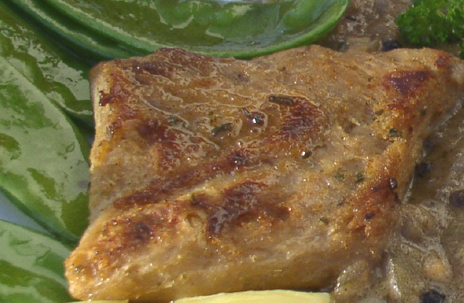 Aufgeweichte Soja-Schnitzeln mit frisch gepressten Knoblauch bestreichen und in heißer Butter